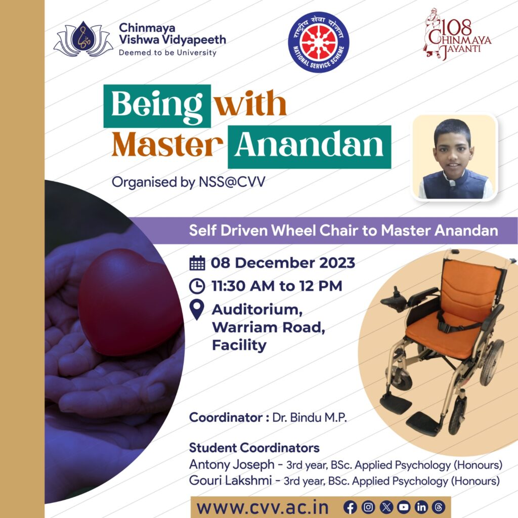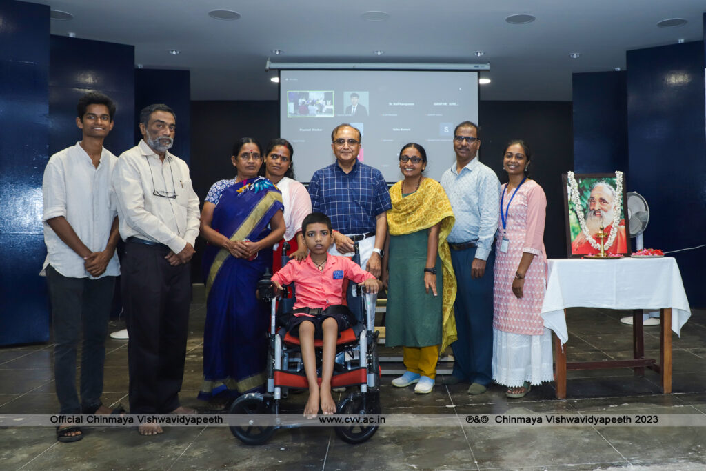 The NSS unit of Chinmaya Vishwa Vidyapeeth (CVV) recently stepped up to provide crucial assistance to Anandan C. A., a 10-year-old student at Kendriya Vidyalaya Kadavanthra, bravely facing the challenges of Type 2 Spinal Muscular Atrophy. In June 2022, NSS and SEVA volunteers fundraised for Anandan’s scooter. Anandan’s condition restricts his mobility, making it impossible for him to walk.